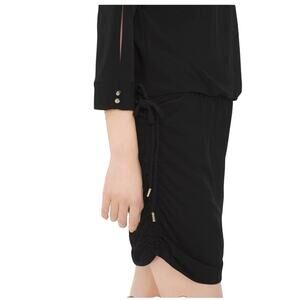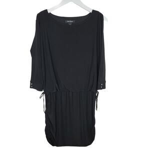 White House Black Market Black Convertible Drawstring Mini Dress. Dress meets shirt. Convertible length with ruched sides and adjustable sliding drawstrings. 3/4 dolman sleeves Rayon/spandex. Machine wash, cold. Lined bodice.