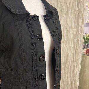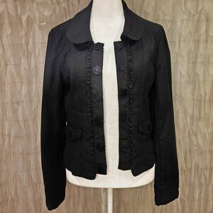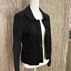 Chic and versatile White House Black Market jacket in women’s size 4. Features a tailored fit with feminine ruffle trim and bold cutout design buttons down the front. Two front pockets add style and function.