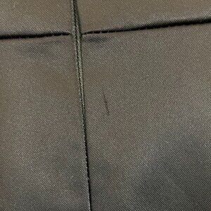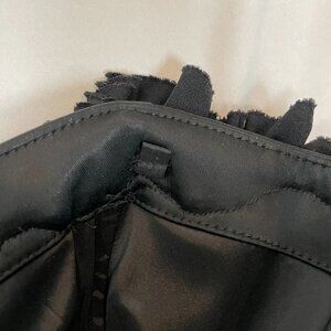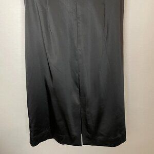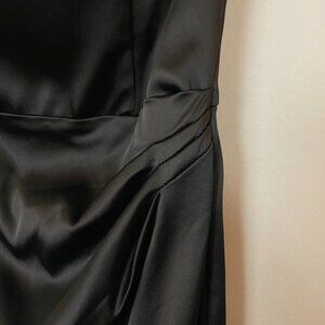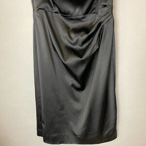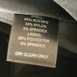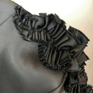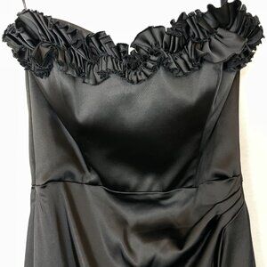 White House Black Market black cocktail satin strapless dress with ruffled sweetheart neckline. Boning structure in bodice. Back zipper. 64% Acetate, 33% Nylon, 3% Spandex. Lining: 95% Polyester, 5% Spandex.