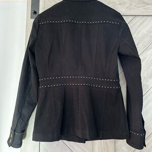 Sophisticated black blazer with studded accents. Features gold buttons and zippered pockets. Ideal for a polished look. Excellent condition