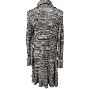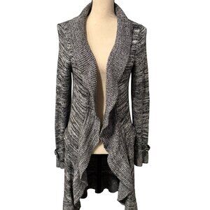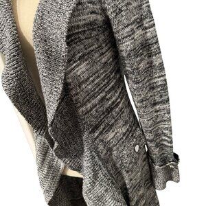 This elegant and versatile cardigan sweater from White House Black Market features a classic black and white pattern, making it a timeless layering piece. Made from a soft blend of cotton and rayon, it offers a comfortable drape and a long length for sophisticated coverage.