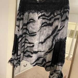 Chic blouse with a striking black and gray pattern. Features intricate lace accents. Ideal for stylish outings.