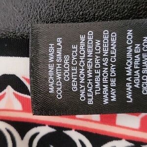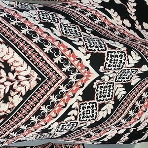 Pretty polyester/rayon dress from WHBM in black with pink, white, tan, and red pattern in size small is very stretchy.