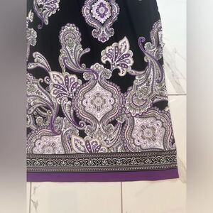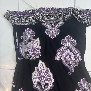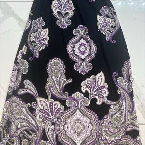 Elegant strapless maxi dress with intricate purple and white patterns. Perfect for evening wear. Such a beautiful piece!