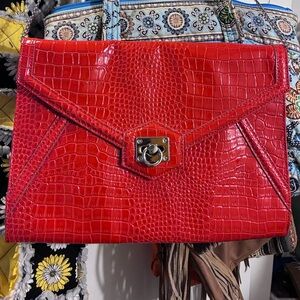 Elegant clutch with floral design. Features a stylish wristlet chain. Perfect for evening events.