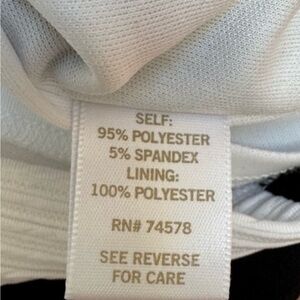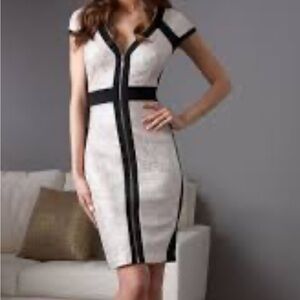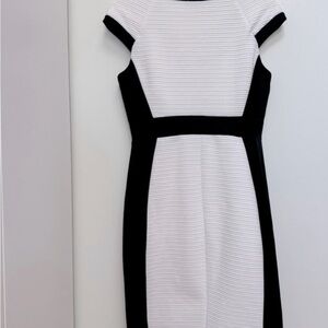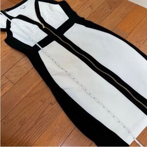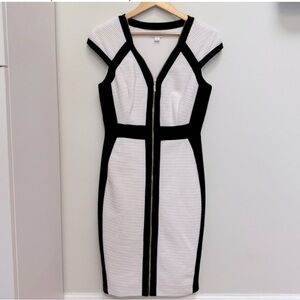 This striking black and white mini dress from White House Black Market features a sleeveless design with a flattering v-neckline. The bodycon sheath style accentuates the silhouette, making it perfect for a cocktail night out. The bold color block pattern adds a modern touch to this elegant piece. Stunning dress!