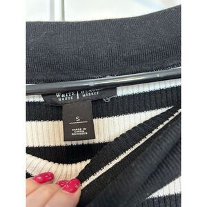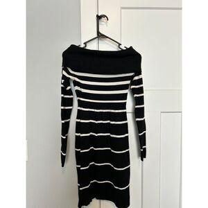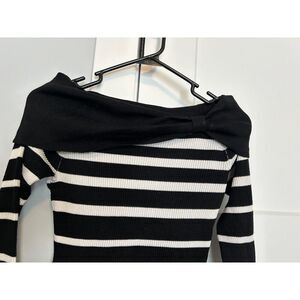 Elegant long sleeve dress with black and white stripes. Off-shoulder design. Perfect for any occasion.