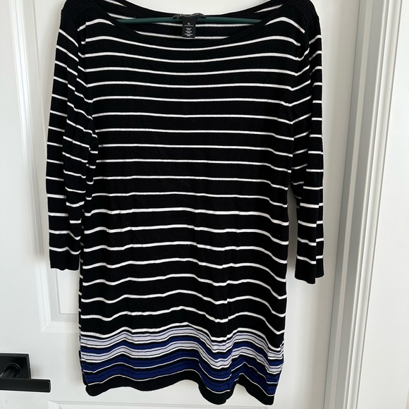 Elegant long sleeve sweater with black and white stripes. Blue accents at the hem. Perfect for versatile styling.