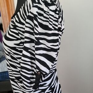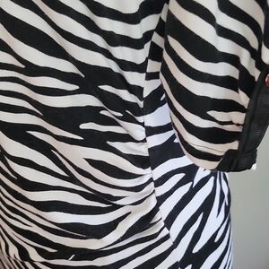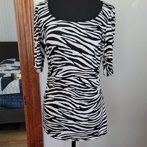 The White House Black Market blouse features a striking black and white zebra print, creating a bold and dynamic look. Its fitted design with ruched details adds a touch of sophistication, making it a versatile choice for various occasions. This tunic-style top combines comfort with a chic aesthetic, perfect for elevating your wardrobe.
