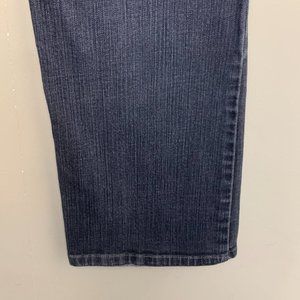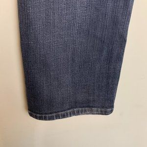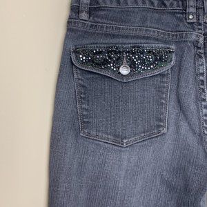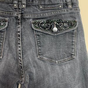 White House Black Market Blanc Bootcut Jeans Size 6 in Black/Dark Gray with a 31-inch inseam. There is some wear on mid-thigh seams and hems, crotch is still in good shape. There is a small white mark on front bottom, left leg, just above the hem. On the right, upper thigh there are ridges. This is most likely from manufacturing/iron imprint. Not really noticeable when wearing. Other than that, these jeans are in good condition. They have a little bit of bedazzling on front and back pockets.