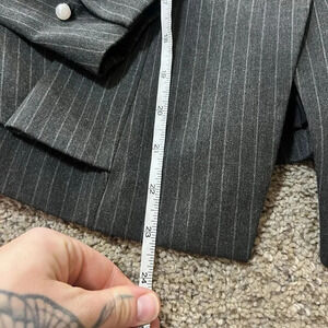 Elevate your wardrobe with this stunning White House Black Market blazer jacket. Perfect for any occasion, this jacket features a classic black striped pattern with pleated, ruffle, and button accents. The jacket has a short length and long sleeves with button closure, making it suitable for both formal and casual events.