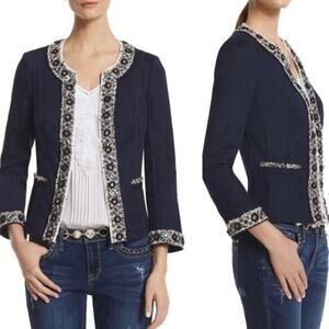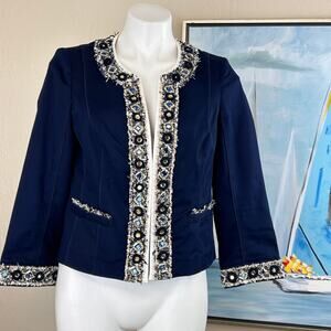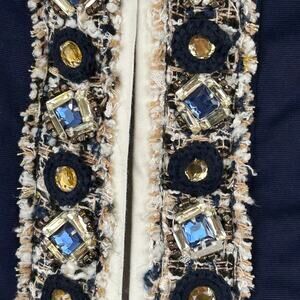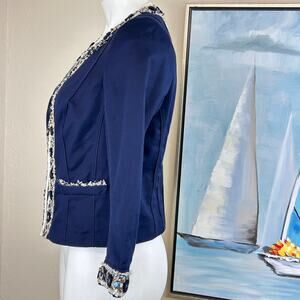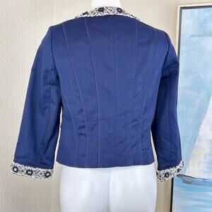 JACKET BOASTS RICH COLLECTION OF BLUE BEADS FRAMED IN BAGUETTES, AND CHAMPAGNE CRYSTALS ENCIRCLED IN KNIT FRAMES.