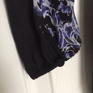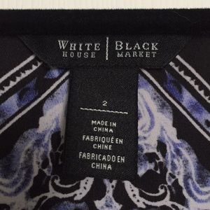 White House Black Market Blouse, Size 2, Scroll print in blue and white, 3/4 sleeves with button bottom, v neck wrap front style with banded bottom, worn only a few times, the only flaw is that the tag is falling off