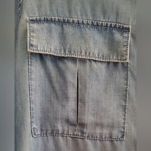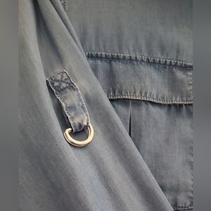 White House Black Market blue chambray long sleeve button down tunic with silver button details and roll tab sleeve option. Size 10.