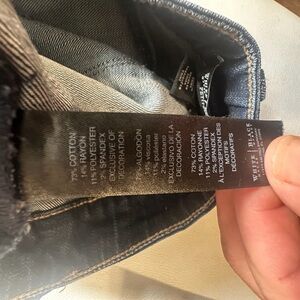 These blue skinny jeans from White House Black Market feature stylish distressed details for a modern, edgy look. The slim fit design ensures a flattering silhouette, while the subtle color variations add depth and character to the denim.