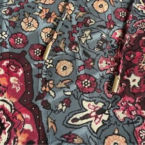 Color: Slate blue base with burgundy, blush, and cream floral medallion print