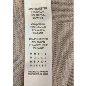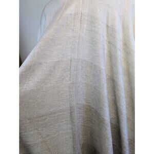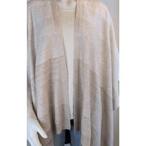 This is a White House Black Market women’s cape, one size fits most. The piece is beige and cream with a soft knit striped texture and features an open front design with a flowing drape. It is lightweight yet has 9% wool for warmth making it an easy layering option over tops, sweaters, or dresses. The neutral tone allows it to pair well with a variety of outfits. It is in excellent condition without notable flaws.