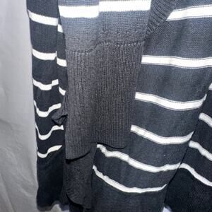 Elevate your layering game with this elegant White House Black Market silk blend cardigan. Featuring a black and white striped design, ruffle trim, and an open front style, this size medium sweater is perfect for chic, effortless outfits.