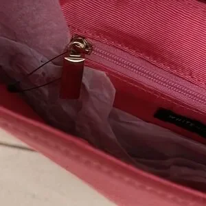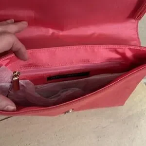 Stylish coral suede clutch from White House Black Market, an ideal accessory for adding a touch of elegance to any outfit. This bag features a fold-over flap with a decorative tassel trim, adding a playful yet sophisticated detail. The interior offers a compact space for essentials like a phone, wallet, and keys, all secured with a zippered pocket. Suitable for a night out, a cocktail party, or a special occasion where you want to carry your belongings in style.