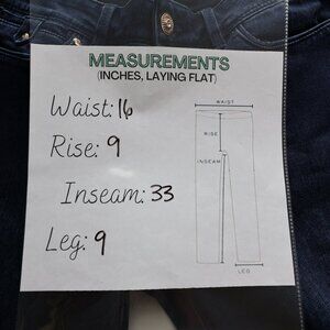 These pants are long. The inseam is 33". There is a missing rivet at one of the pockets. See photo. See photos for measurements and fabric content. If you have any questions about this item, I’ll be happy to answer them. Due to the lighting and different device settings (yours and mine), colors may differ slightly.