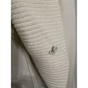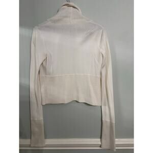 Chic and elegant White House Black Market cropped cardigan in a soft ivory/cream knit with a dramatic open-front drape. Features ribbed shawl collar, ribbed cuffs, and a sleek cropped silhouette—perfect for layering over dresses or tops for polished, modern styling.