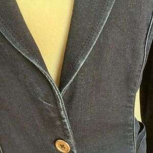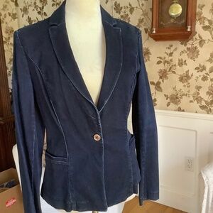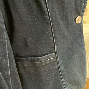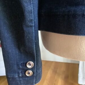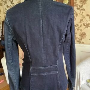 This jacket is in the great used condition. Length is 22.5 in, shoulders 16 in. The fabric has stretch in it - 95% cotton, 2% spandex, 3% other fibres. Comes from smoke free, pet free home.