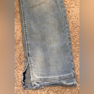 Trendy distressed jeans. Light wash. Frayed hem. Bin 45