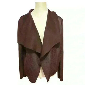Our drape-front jacket brings together color and texture for bold, beautiful style. In a rich cabernet, the faux-leather silhouette is enhanced by a chic snake texture with faux-suede lapels for added impact.