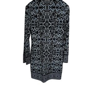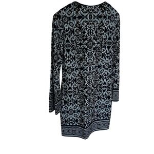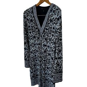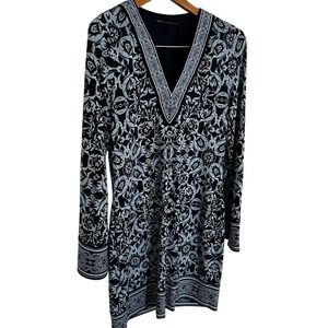 Enchanting elegance unfolds in this White House Black Market dress, where a mesmerizing floral print dances across a sophisticated silhouette. The deep V-neckline, framed by a decorative border, draws the eye and flatters the décolletage, while the long sleeves offer graceful coverage. A coordinating border at the hem adds a polished finish to the knee-length design. Perfect for a chic brunch, a sophisticated office setting, or an elegant evening out, this dress effortlessly transitions from day to night.