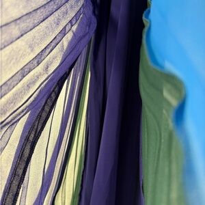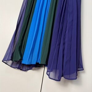 This stunning dress from White House Black Market is perfect for any formal occasion. The bold colorblock design in midnight indigo, isla, and eden is eye-catching and unique. The braided halter neckline adds a touch of femininity, while the pleated, sash belt, and layered accents create a flattering silhouette.