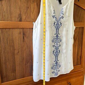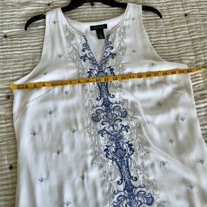 White House Black Market Embroidered White and Blue SleevelessTunic
