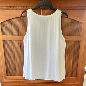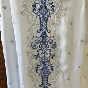 White House Black Market dressed up sleeveless tunic with dark blue, white and silver embroidered front. Easy care machine washable polyester material. Lined size large.. Looks great worn dressed up or with jeans. In great condition. Smoke and pet free home.