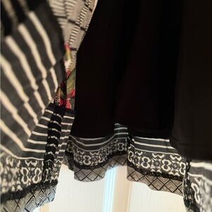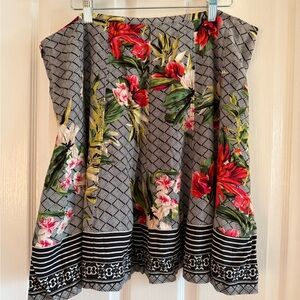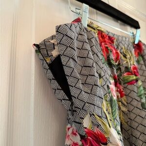 Vibrant floral Skirt Size 14 with red flowers. Green leaves add freshness. Black geometric pattern for a chic look. lined and size hidden zipper in EUC