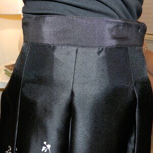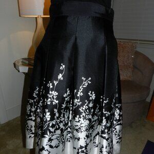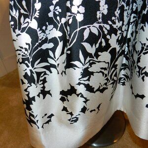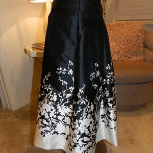 Style name is Satin Floral Print Midi. Colors are black and white (ecru). Item is NWT. Tried on, but never worn. No holes or stains. The skirt has a hidden zipper in back with hook and eye for closure. White lining. Side seam pockets. See pictures for additional description.