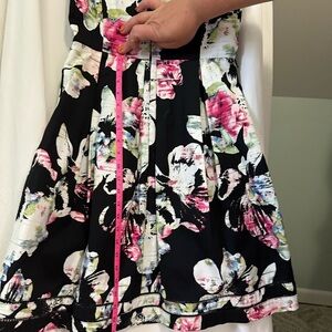 Stylish floral dress with a sleeveless design with v shaped back. Dress is by White House Black Market. Dress flares out and tight at waist. Beautiful