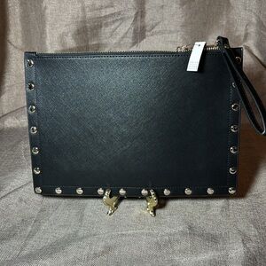 Beautiful large studded wristlet pouch. Zipper top closure with attached strap. Zipper pull still in plastic. Gold-tone hardware. Large enough to carry all that you need, phone, keys, small card case if need be. Removable pull strap which is attached by a circle ring inside.