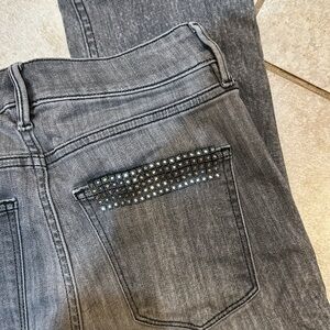 Gently worn White House Black Market High Rise Boot Crop jeans women’s size 2. Washed gray, high rise, stretch denim, boot cut leg opening, crop length, five pocket styling, fun silver metal sequin trim, matching trim on rear pockets. Offers accepted!