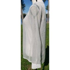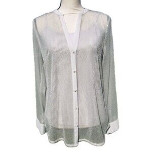 Beautiful blouse for women by White House Black Market. Light gray with small sequins on exterior. Light gray poly crepe cuffs and trim, button front, semi- sheer. Excellent condition with no holes, rips, stains or tears