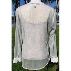 This White House Black Market Gray Sequin Sheer Top with Stretch Tank Shell in size Small is a chic and elegant blouse perfect for formal occasions like weddings, parties, or cocktails. The top features a Split Neck, long sleeves, and silver sequin accents that add a touch of glamour. Made with a classic fit and button closure, this blouse is versatile enough to wear in all seasons and is sure to make a stylish statement at any even
