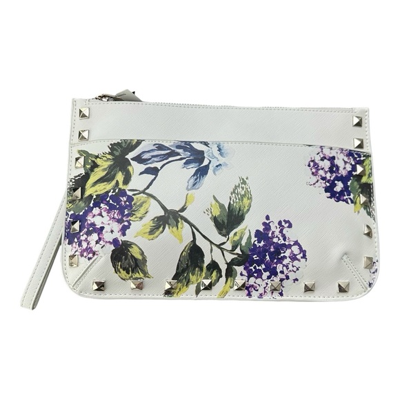 White House Black Market Hydrangea Studded Wristlet Clutch Floral White NWT