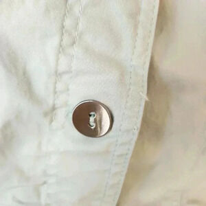 Mint green jean jacket with shoulder tab button detail. Size 4. Very soft and perfect for over dresses or a top. Has small stain near button, please see last picture (it's very hard to see in the pic), barely noticeable but would probably come out with further stain treament.