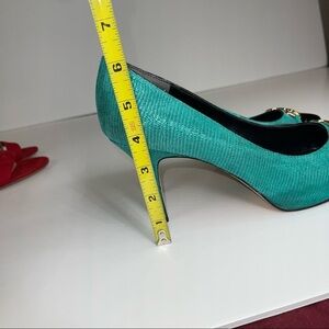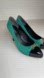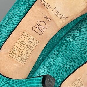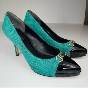 White House Black Market Jade Green Black Pump Heel features a gold tone buckle and black patent toe detail.