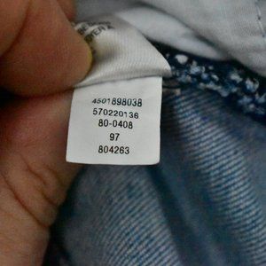 Mid rise, five pocket, zip closure, soft super stretch denim with white paint