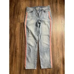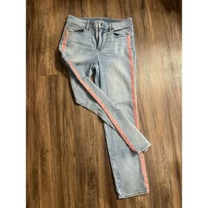 Great condition women’s denim with a cute blush pink detail down outside of leg. No holes or stains. 28 1/2 “ inseam