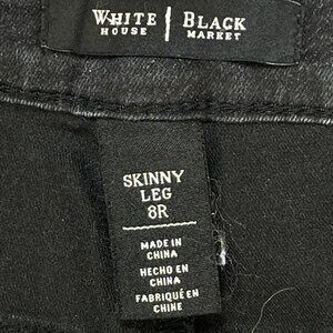 White House Black Market Ankle Skinny Women's 8R Black Shimmer Jeans. These jeans have a black shimmer effect, they measure 30x28. The jeans have a mid rise waist and have leg zippers. See the photos for details.
