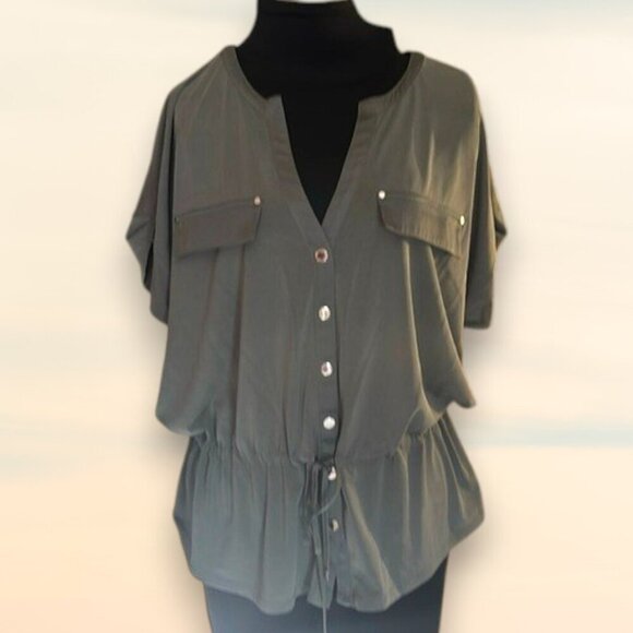 White House Black Market Khaki Green Short Sleeve Blouse Large