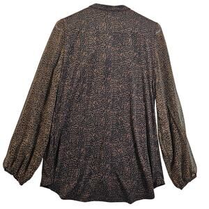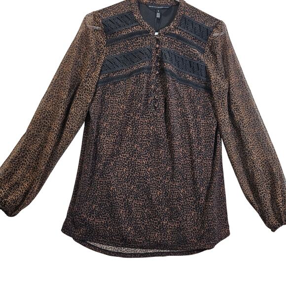 White House Black Market Brown Black Cheetah Top 1/2 Button Lace Sheer Sleeve Blouse Size Medium New Animal Print Classy Timeless Lurex