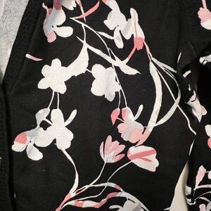 White House Black Market floral cardigan in a size Medium. Black with pink and white. Features a flattering V-neckline, snap button closure, and a lightweight knit perfect for layering. Sweater has always been folded. Only out on a hanger for picture.