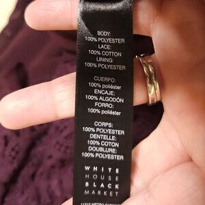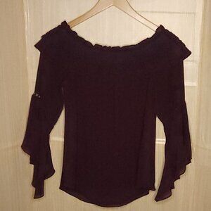 White House Black Market women’s maroon black off the shoulder crochet silky top medium. Gently used condition. Measurements are: 20” sleeve (measured from neck seam), 23 ½" from shoulder to hem, and 19 ½" from armpit to armpit.
