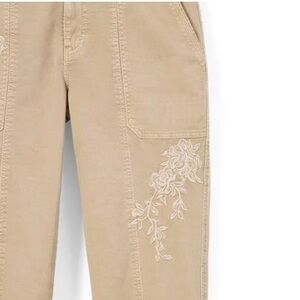Chic crop pants with intricate tonal embroidery. Lightweight. Very soft. Slight stretch. Zipper. Double button closure.